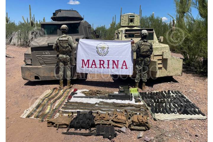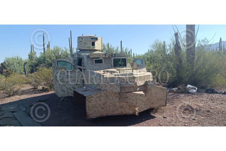 CABORCA, SONORA, 05SEPTIEMBRE2024.- La Secretaría de Marina a través de la Armada de México, por medio de la Sexta Región Naval, con sede en Guaymas informó que personal naval aseguró dos vehículos con blindaje artesanal, armamento y cartuchos en la comunidad de Banori, mejor conocidos como camiones “monstruos”, en el municipio de Caborca, Sonora. Esta acción se llevó a cabo durante recorridos de vigilancia aérea y terrestre, en donde personal naval detectó y aseguró dos vehículos con blindaje artesanal, los cuales posterior a su producción son presuntamente entregados a grupos de la delincuencia organizada; asimismo, armamento, cargadores, cartuchos y equipo táctico. FOTO: SEMAR/CUARTOSCURO.COM
