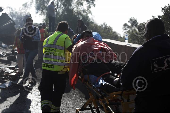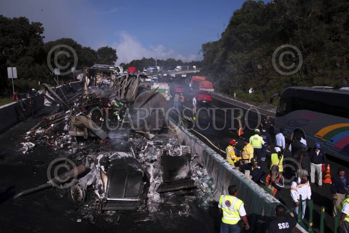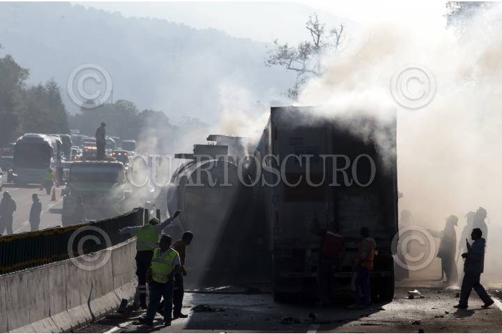 HUITZILAC, MORELOS. 14SEPTIEMBRE2016.- Una pipa que transportaba 27 mil litros de fructuosa y un tracto camión cargado con abarrotes chocaron y se incendiaron en el kilómetro 61+500 de la autopista México-Cuernavaca a la altura del poblado de Coajomulco en Huitzilac. Los hechos ocurrieron aproximadamente a las 07:43 cuando el chofer del tráiler no pudo controlar el vehículo impactando contra la pipa, derivado de este percance los vehículos ardieron. Una camioneta Jeep que se encontraba estacionada en el acotamiento también fue impactada y un autobús recibió un golpe menor. La mujer que manejaba la camioneta y el chofer del tracto camión resultaron con lesiones leves, aun así fueron trasladados al hospital para su valoración médica. Este accidente entre vehículos pesados provoco que el tránsito vehicular en ambos sentidos se detuviera por dos horas. Personal de protección civil del estado, de Cuernavaca y de Huitzilac acudieron en apoyo, así como la Policía Federal, Capufe y Mando Único. FOTO: MARGARITO PÉREZ RETANA /CUARTOSCURO.COM