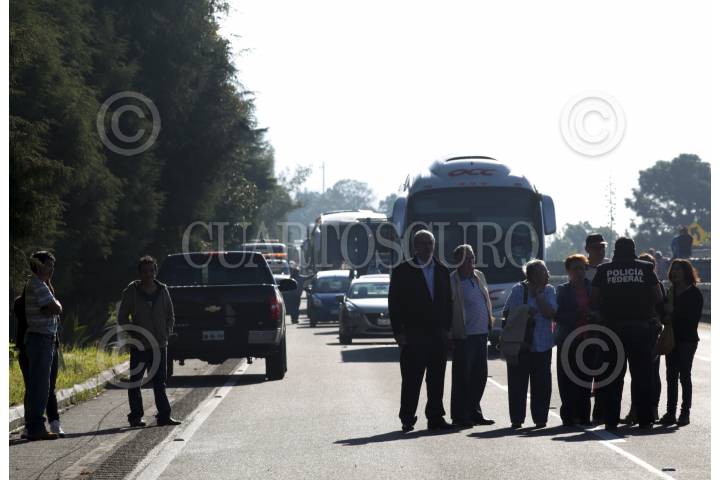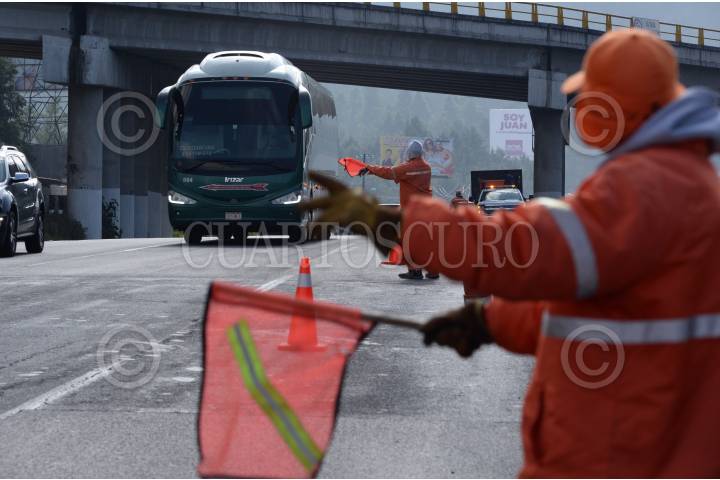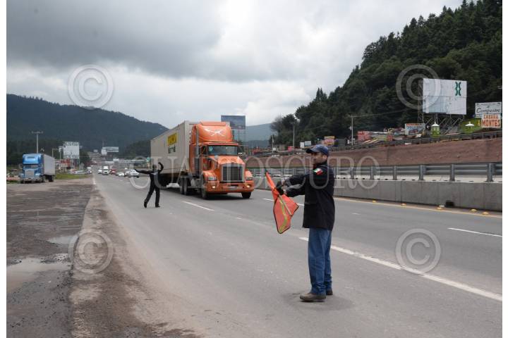 OCOYOACAC, ESTADO DE MÉXICO, 29MAYO2017.- La Policía Federal y trabajadores de la autopista La Marquesa-Lerma fue instalado de manera permanente un operativo para impedir la circulación por esta vía de camiones pesados y de carga, esto luego de el pasado fin de semana un camión tipo “Torton” choco contra la caseta y provocará la muerte de cuatro personas, a pesar de las restricciones mucha unidades de estas características se siguen de filo. FOTO: ARTEMIO GUERRA BAZ /CUARTOSCURO.COM