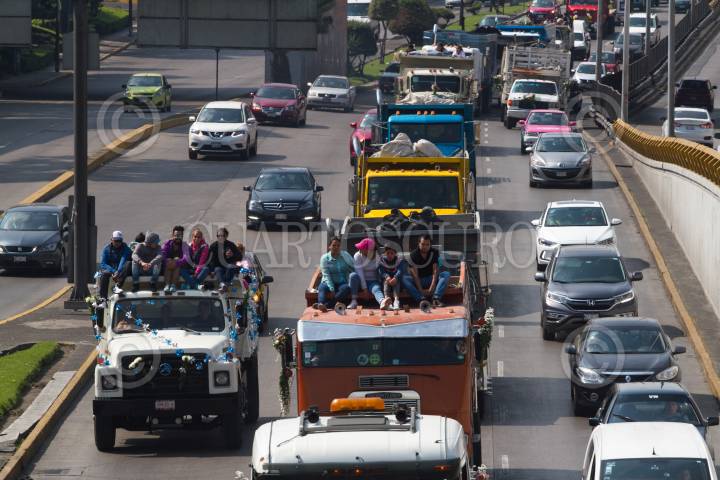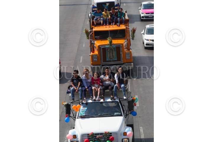 CIUDAD DE MÉXICO, 29OCTUBRE2017.- Camiones de carga con cientos de personas rodaron en caravana hacia la Basílica de Guadalupe, decenas de las pesadas unidades circularon por el Circuito Interior provocando gran caos vehicular. FOTO: MOISÉS PABLO /CUARTOSCURO.COM