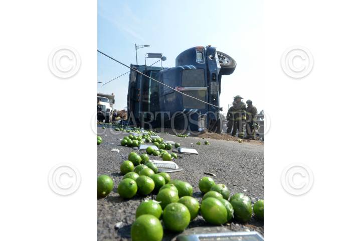 CIUDAD DE MÉXICO, 18DICIEMBRE2017.- Tras una persecución un camión cargada de frutas y verduras terminó volcada en el puente vehicular del Eje 3 Oriente Arneses y la Avenida Taxqueña, en la colonia San Francisco Culhuacán. El conductor fue detenido. FOTO: ARMANDO MONROY /CUARTOSCURO.COM