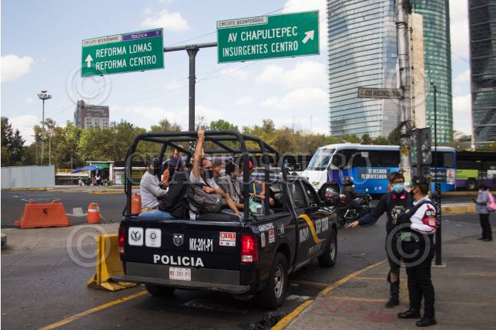 Usuarios abordan una camioneta de la policía en el metro Chapultepec, la cual los llevará a la estación Tacubaya. Ayer se suscitó un incendio en la subestación del Metro, ubicada en la calle de Delicias, lo que provocó la interrupción del servicio