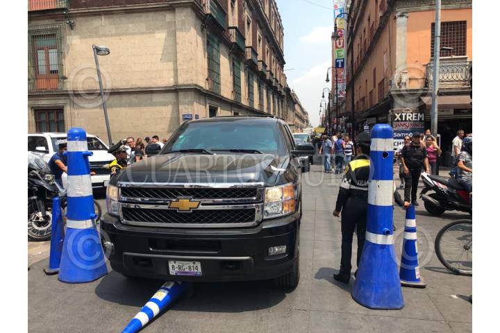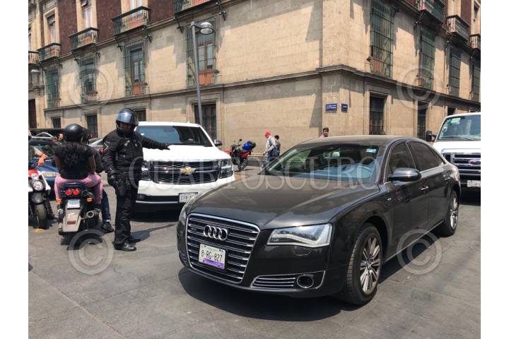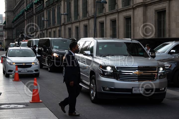 Camionetas blindadas que trasladan a la delegación del gobierno de Estados Unidos permanecen estacionadas afuera de Palacio Nacional.