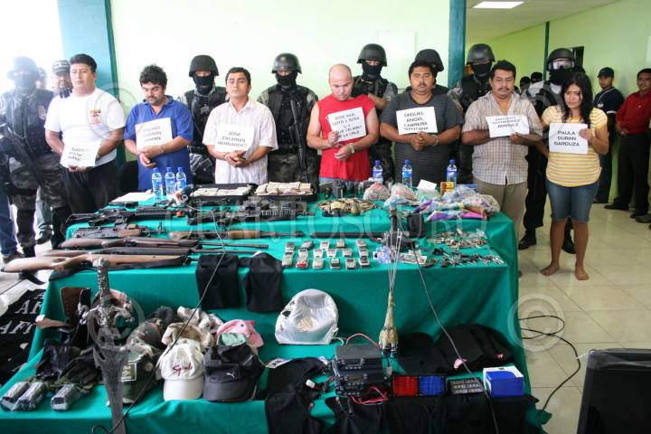 VILLAHERMOSA, TABASCO, 23ABRIL2007.- En las instalaciones de la Procuraduría General de Justicia se llevo a cabo la presentación de una peligrosa banda delictiva, ahí exhibieron un arsenal en armas largas y cortas, uniformes y camisas con la leyenda A.F.I. Presumen que estos malhechores tienen relación con “Zetas”. FOTOS: MARCO POLO GUZMÁN HERNÁNDEZ/CUARTOSCURO.COM