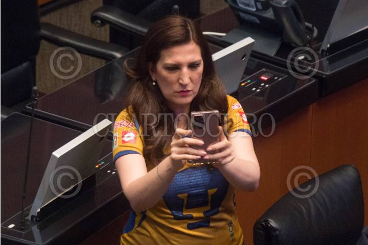 Kenia López Rabadán, senadora del PAN, portó una camiseta de los Pumas de la UNAM, durante la sesión ordinaria de la Comisión Permanente del Congreso de la Unión.