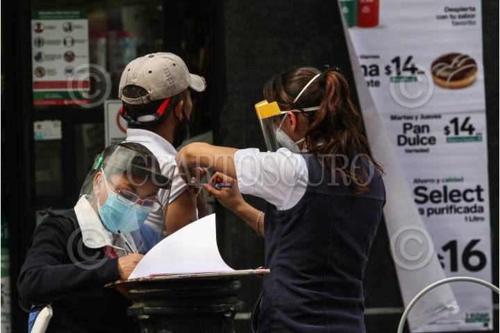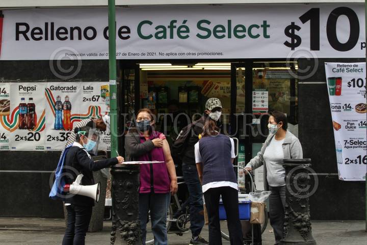 Enfermera vacuna a mujer frente a tienda de conveniencia en la alcaldía Iztapalapa.