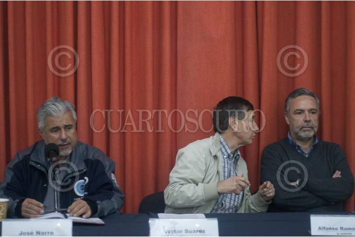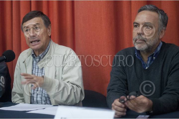 MÉXICO, D.F., 07JULIO2014.- José Narro Céspedes, de la Coordinadora Nacional Plan de Ayala (CNPA); Víctor Suárez Carrera, director ejecutivo de la Asociación Nacional de Empresas Comercializadoras de Productores del Campo, (ANEC), y Alfonso Ramírez Cuellar, dirigente del Barzón Nacional, durante una conferencia de prensa en el Centro Nacional de Comunicación Social (Cencos) para hablar sobre el daño que tendrá el campo mexicano ante la reforma a las leyes secundarias en materia energética. FOTO: DIEGO SIMÓN SÁNCHEZ /CUARTOSCURO.COM