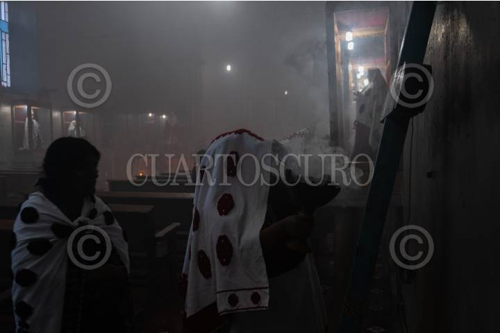 Las mujeres que tienen cargos dentro de la autoridad religiosa, recorren la iglesia con incienso para agradecer a los santos.