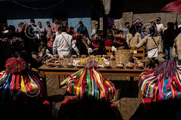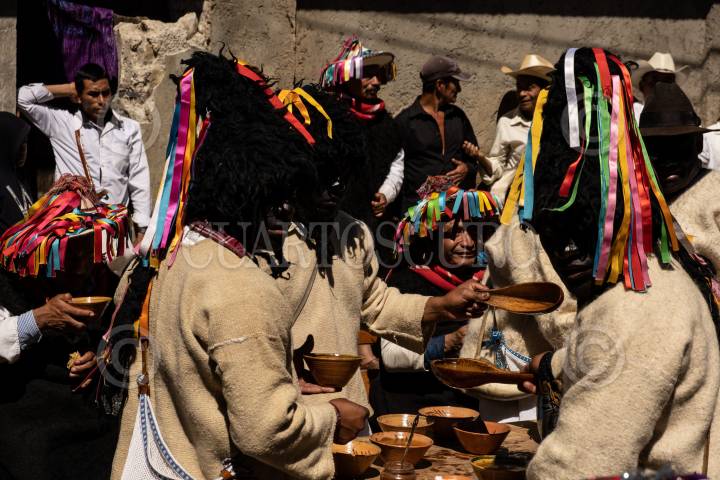 Autoridades religiosas y tradicionales bailan, cantan y comparten alimentos y bebidas simbolizando la abundancia de las cosechas.