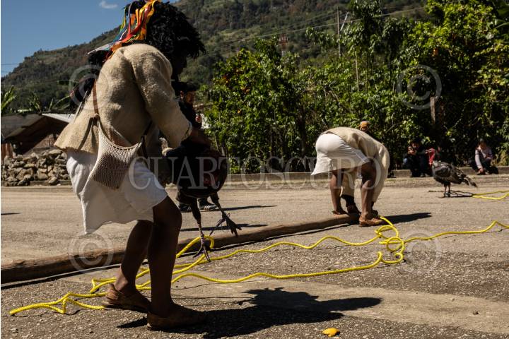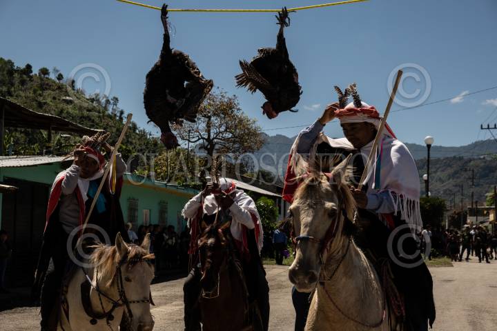 Los encargados de la actividad principal cuelgan en un lazo a los guajolotes que se sacrificaran al final de las carreras de caballos.