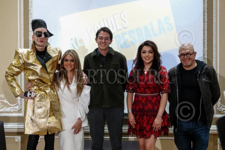 CIUDAD DE MÉXICO, 31ENERO2024.- El conductor de televisión y asesor Edy Smol “El Gurú de la Moda”; la conductora Yazmín Jalil; Carlos Brito Lavalle, director de Canal Once; Daniela cordero, abogada y también será conductora, y el monero Rapé durante la conferencia de prensa para presentar el nuevo programa que encabezará llamado “Respondes o Resbalas” por el Canal Once. La programación constará de invitados de la política, arte y espectáculos que pondrán a prueba sus conocimientos y expondrán sus posturas sobre diversos temas de coyuntura. FOTO: GALO CAÑAS/CUARTOSCURO.COM