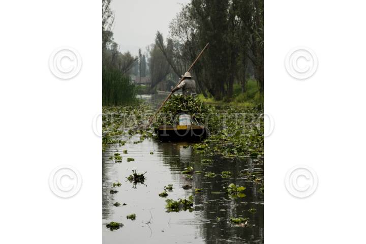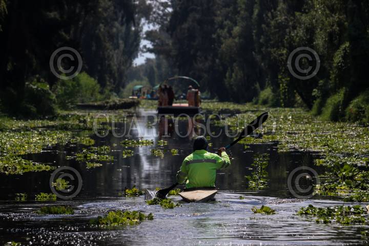Un trabajador limpió la maleza acuática del Embarcadero Cuemanco, alcaldía Xochimilco