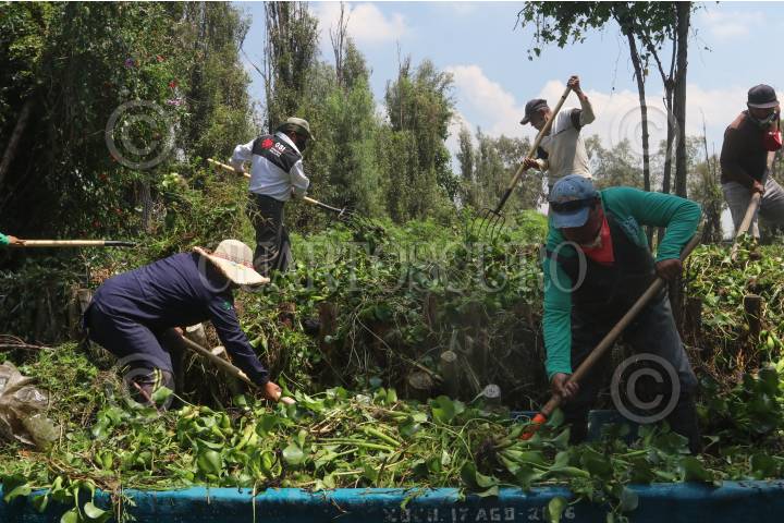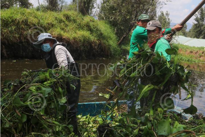 Trabajadores y voluntarios limpiaron la maleza acuática del Canal de Tochipo, alcaldía Xochimilco
