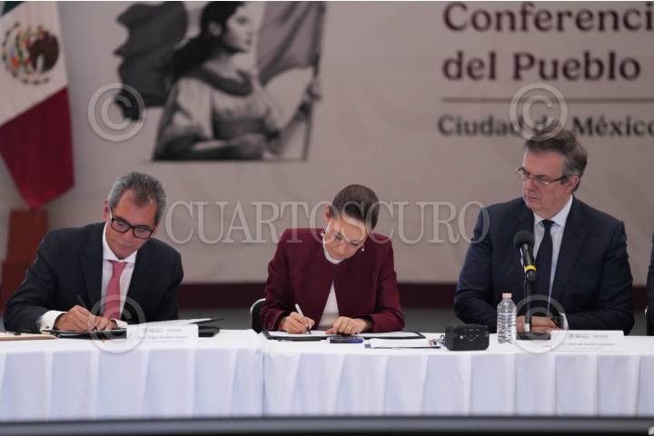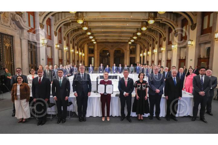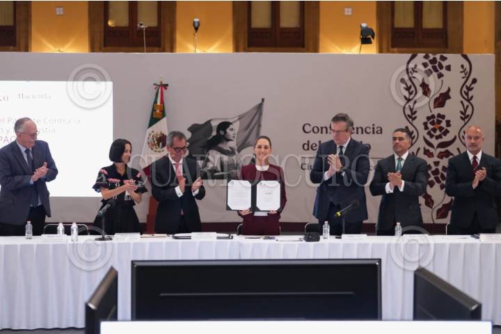 CIUDAD DE MÉXICO, 12MAYO2025.- Edgar Amador Zamora, Secretario de Hacienda; Claudia Sheinbaum, Presidenta de México, y Marcelo Ebrard, Secretario de Economía, encabezaron la firma de renovación del Paquete contra la Inflación y la Carestía (Pacic) con tiendas de autoservicio y productores agropecuarios; este acuerdo significa que no aumentará el precio de los 24 productos de la canasta básica, en Palacio Nacional. FOTO: PRESIDENCIA/CUARTOSCURO.COM