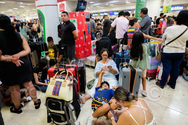 CANCÚN, QUINTANA ROO. 19JULIO2024.- Largas de filas de pasajeros esperan en la terminal 2 del aeropuerto internacional de Cancun, debido a las interrupciones debido a la falla en el sistema operativo Windows de Microsoft, las aerolineas afectadas por las cancelaciones incluyen Viva, United,Spirit, Sun Country, Aeromexico, Delta y Frontier. FOTO: ELIZABETH RUIZ/CUARTOSCURO.COM