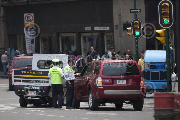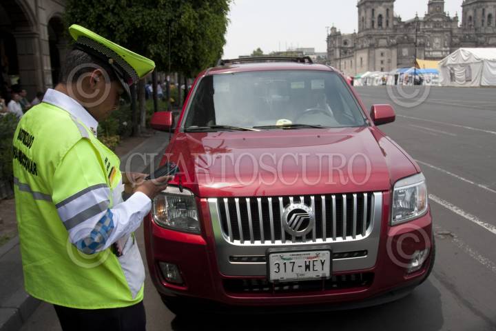 MÉXICO D.F., 25ABRIL2011.- La Secretaría de Seguridad Pública del Distrito Federal (SSPDF) inicio este lunes un operativo en el que participarán 50 grúas, 30 vehículos que portan los inmovilizadores conocidos como “arañas” y cien policías esto con el fin de que cualquier vehículo que se encuentre estacionado en las calles del Centro Histórico será multado y remitido al corralón sin tolerancia. Unas personas que se identificaban como supuestos trabajadores de la asamblea legislativa fueron interceptados por elementos de policía y transito al intentar evitar ser multados por estar estacionada en lugar prohibido los cuales terminaron pagando su multa. FOTO: GUILLERMO PEREA/CUARTOSCURO.COM