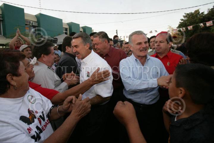 LOS MOCHIS, SINALOA 07ABRIL2006.- Roberto Madrazo Pintado,Candiato Presidencial de la alianza por Mèxico, y Francisco Labastida Ochoa Ex-Candidato presidencial por el PRI, acompañados por candidatos al Senado por esa entidad, saludan a lo simpatizantes. FOTO: PRI/CUARTOSCURO.COM
