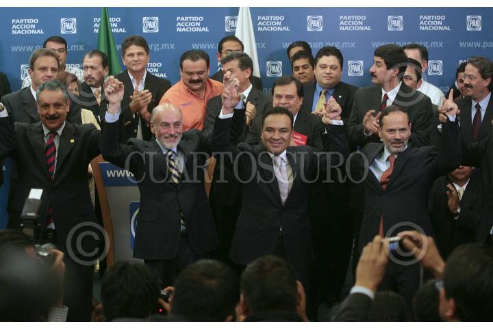 MÉXICO, D.F., 29MARZO2011.- Los precandidatos del Partido Acción Nacional a la gubernatura del Estado de México acordaron unir esfuerzos en torno a la candidatura de Luis Felipe Bravo Mena, quien será el encargado de enfrentar el reto y propiciar el progreso de los mexiquenses en las próximas elecciones del 3 de julio, informó el presidente nacional del PAN, Gustavo E. Madero Muñoz. En conferencia de prensa, rodeado de los principales líderes de la entidad, el Presidente del partido hizo un reconocimiento especial a José Luis Durán Reveles y Ulises Ramírez. FOTO: ESPECIAL/CUARTOSCURO.COM