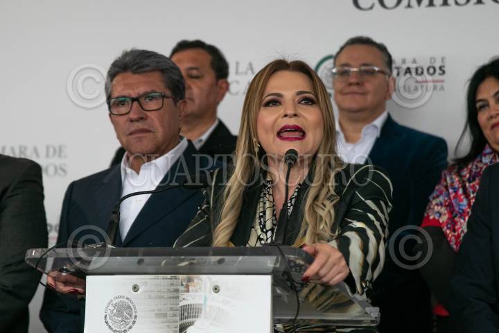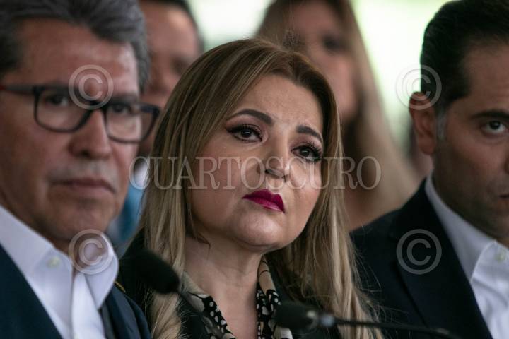 CIUDAD DE MÉXICO, 26JUNIO2024.- Claudia Delgadillo, candidata de Morena a la gubernatura de Jalisco, ofreció una conferencia de prensa acompañada de Ricardo Monreal, coordinador de los senadores de Morena, e integrantes de esta bancada, para denunciar diversas anomalías en las elecciones pasadas en las que acuso un contubernio entre Movimiento Ciudadano y el Instituto Electoral y de Participación Ciudadana del Estado de Jalisco (IEPC Jalisco) para favorecer a su candidato Pablo Lemus. El encuentro se llevó a cabo en el Senado de la República, en donde el zacatecano mostró todo su respaldo a Delgadillo en este proceso de impugnaciones que emprenderá para revertir la elección. FOTO: MOISÉS PABLO/CUARTOSCURO.COM