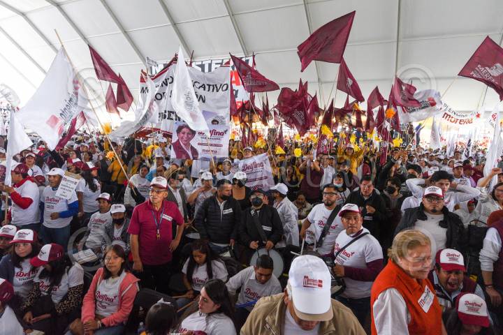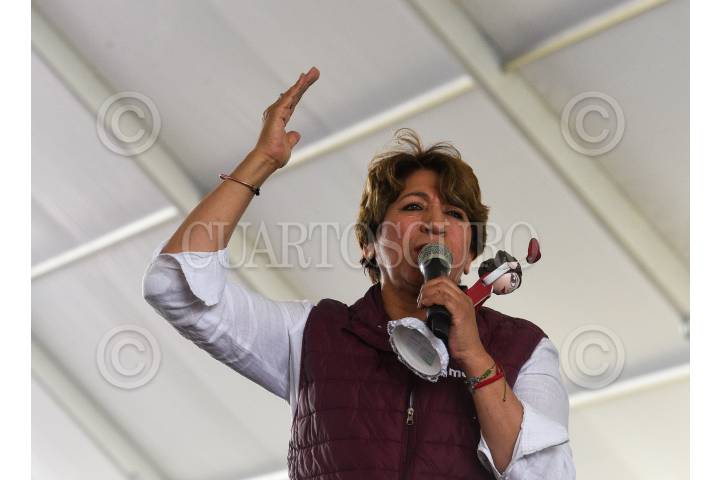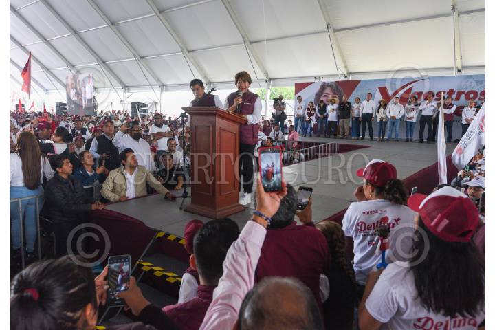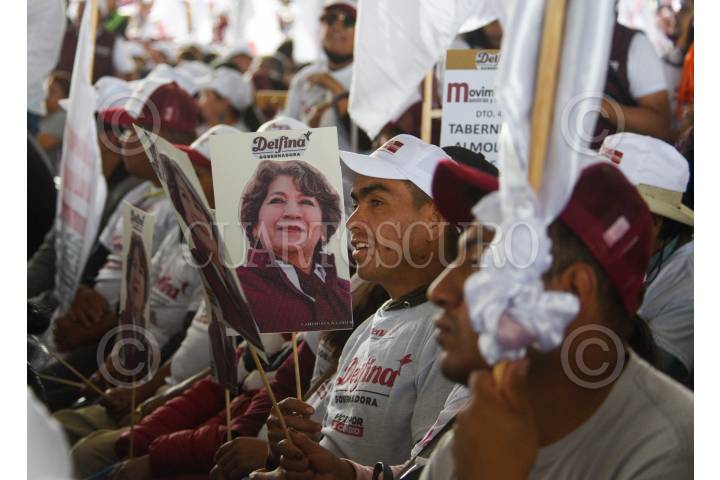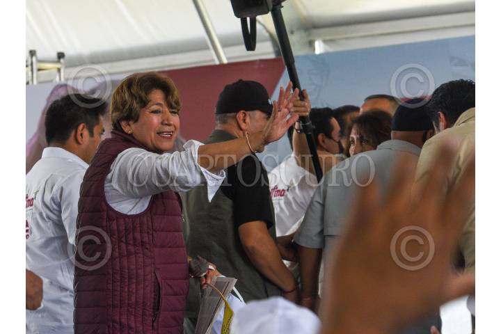 Delfina Gómez candidata a la gubernatura del Estado de México por MORENA, PVEM y PT sostuvo un encuentro con el magisterio mexiquense en San Pablo Autopán, en Toluca.