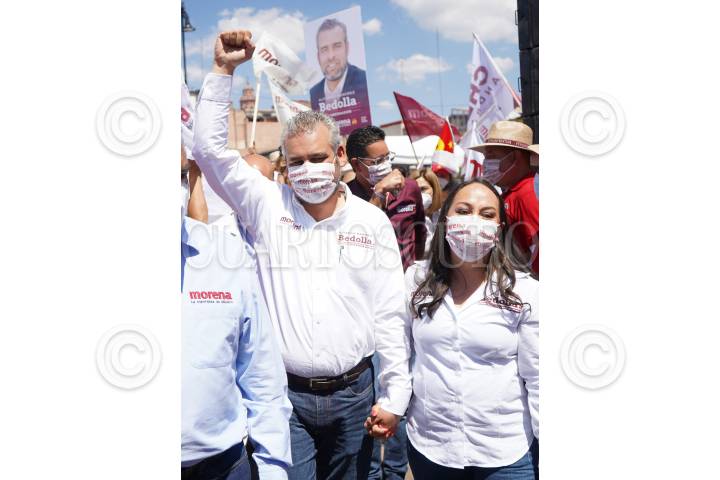 Alfredo Ramírez Bedolla, candidato a la gubernatura de Michoacán, junto a su esposa Grisel Tello Pimentel durante el mitin de arranque de campaña.