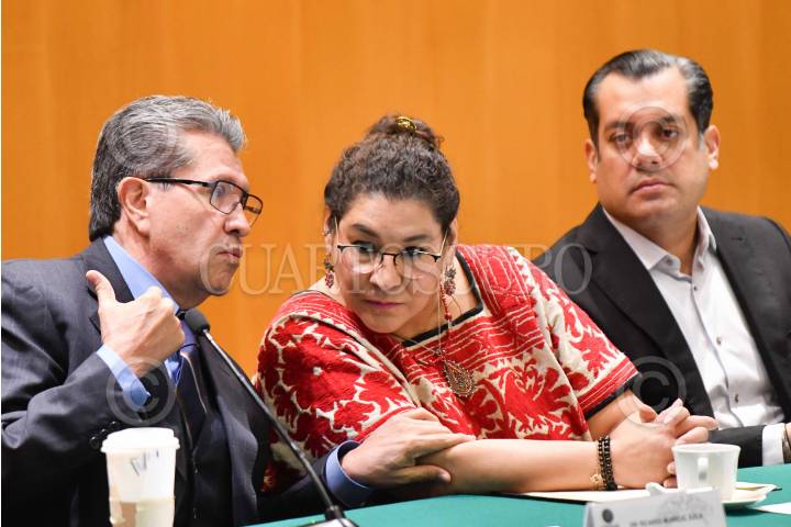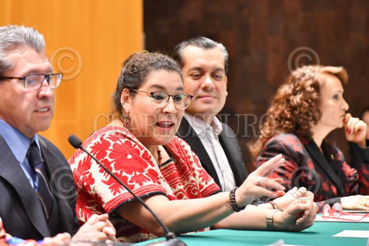 CIUDAD DE MÉXICO, 25FEBRERO2025.- Lenia Batres, ministra de la Suprema Corte de Justicia (SCJN) y actual candidata para repetir dicho cargo, durante su reunión en la plenaria del grupo parlamentario de Morena realizada en el Auditorio Aurora Jiménez de la Cámara de Diputados. La acompaña Ricardo Monreal, diputado y coordinador del grupo parlamentario de Morena en la Cámara de Diputados, y Sergio Gutiérrez, presidente de la mesa directiva. FOTO: MARIO JASSO/CUARTOSCURO.COM