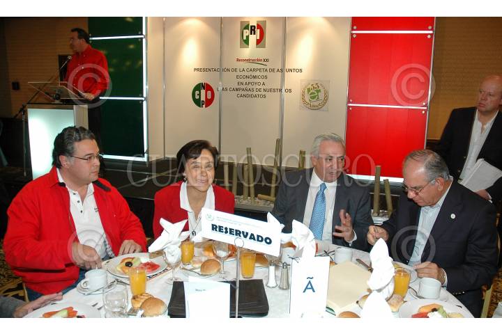 MÉXICO, D.F., 24MAYO2009.- La senadora María de los Ángeles Moreno, el canditado del PRI a la delegación Miguel Hidalgo Martín Olavarrieta, Marco Antonio Bernal de CNOP y Jesús Alberto Cano presidente de la Liga de Economistas durante un desayuno de la Liga de Economistas en apoyo a las campañas de los candidatos del PRI. FOTO: RODOLFO ANGULO/CUARTOSCURO.COM