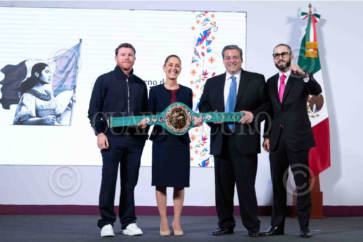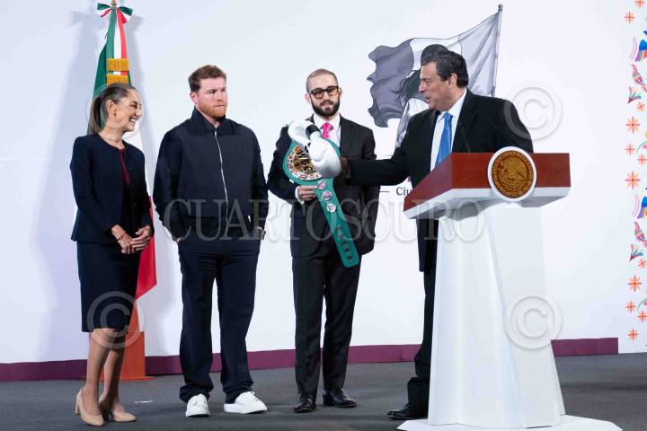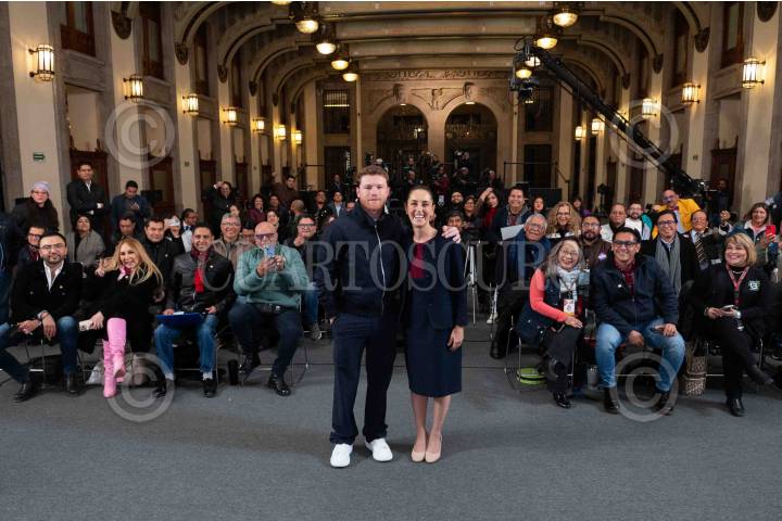 CIUDAD DE MÉXICO, 29NOVIEMBEE2024.- Claudia Sheinbaum, presidenta de México, durante la conferencia matutina realizada en Palacio Nacional, acompañada de Saúl "El Canelo" Álvarez. FOTO: PRESIDENCIA/CUARTOSCURO.COM