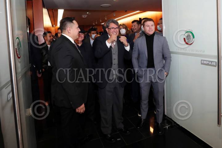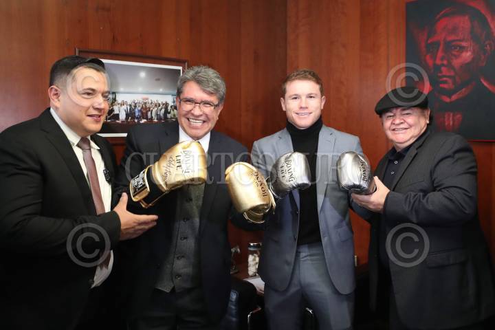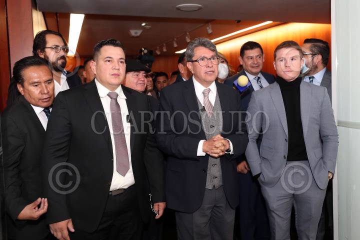 Eddy Reynoso, entrenador de Box; Ricardo Monreal, presidente de la Jucopo; Saúl "Canelo" Álvarez, y Chepo Reynoso, conversan en el Senado, en donde Eddy recibió un homenaje por su carrera en el boxeo.