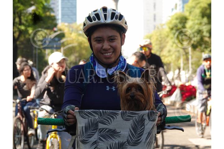 CIUDAD DE MÉXICO, 15DICIEMBRE2024.- Un perro descansa en una canasta de bicicleta, durante el Paseo Dominical, en Avenida Paseo de la Reforma. MAGDALENA MONTIEL/CUARTOSCURO.COM