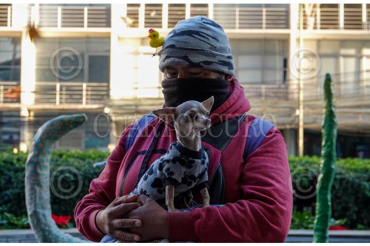 CIUDAD DE MÉXICO, 15DICIEMBRE2024.- Un hombre carga a un perro de raza Chihuahua: este tipo de razas es una de las más antiguas del continente americano. FOTO: MAGDALENA MONTIEL/CUARTOSCURO.COM