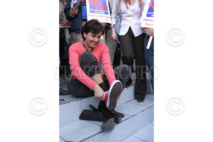 MÈXICO, D.F. 06FEBRERO2006.- Patricia Mercado, Candidata del Partido Alternativa Socialdemocrata y Campesina cambiò sus botas por unos tenis afuera de la plaza comercial del Metro Pinos Suárez. FOTO.Miriam Sánchez/CUARTOSCURO.COM