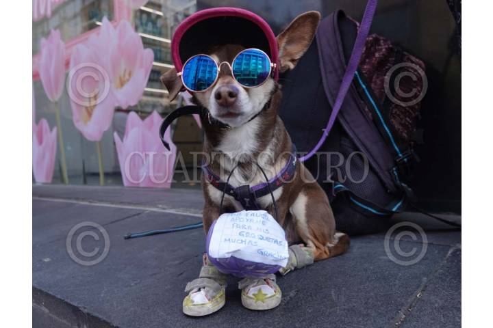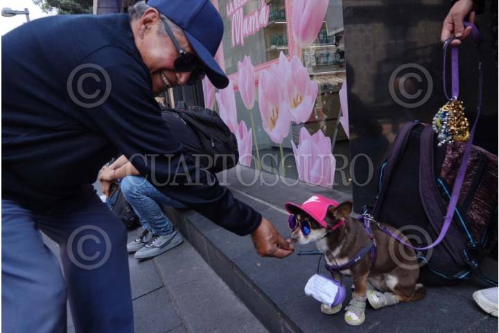 CIUDAD DE MÉXICO, 23ABRIL2025.- Con el nombre de Ana, una perrita salchicha pide apoyo para sus croquetas en la calle de Madero en el Centro Histórico. FOTO: GRACIELA LÓPEZ/CUARTOSCURO.COM