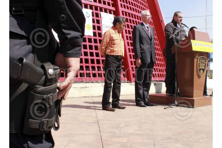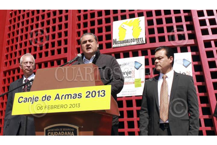 CIUDAD NEZA, ESTADO DE MÉXICO 06FEBRERO2013.- Salvador Neme Sastre, titular de la SSC, Juan Zepeda, edil de Neza, y Jorge Amador Amador, director de seguridad pública de Neza, anunciaron que el próximo Lunes iniciara el canje de armas en el municipio. FOTO: CUARTOSCURO.COM