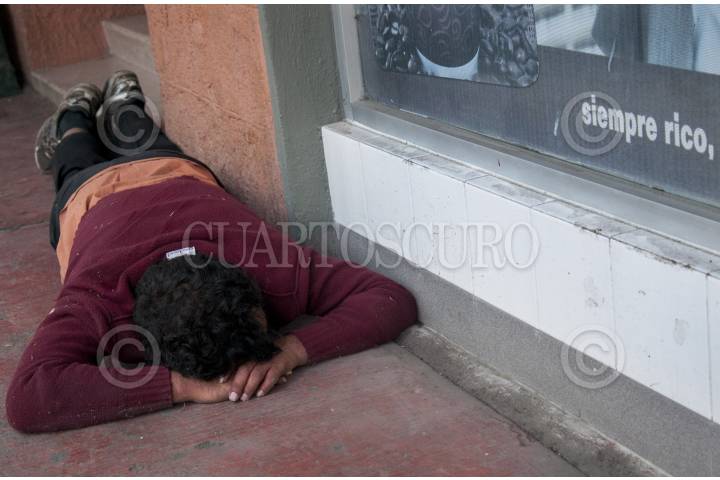 MÉXICO, D.F., 09MAYO2015.- Una persona en situación de calle duerme al pie de una tienda de conveniencia de la colonia Condesa. Su sueño se observa "siempre rico", como se lee en la publicidad de una marca de café. FOTO: DIEGO SIMÓN SÁNCHEZ /CUARTOSCURO.COM