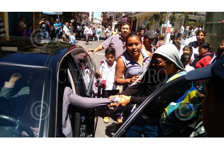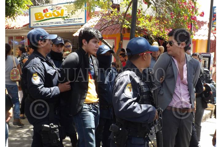 CHILPANCINGO, GUERRERO, 14MARZO2016.- Dos jóvenes que viajaban en un auto BMW color negro presuntamente intentaron embestir a manifestantes de la escuela primaria "Figueroa Mata", ubicada en la colonia del mismo nombre, los agredidos bloqueaban las calles para pedirle al gobierno que reconstruya su plantel educativo. Los señalados fueron detenidos por elementos de la Policía Municipal. FOTO: CUARTOSCURO.COM