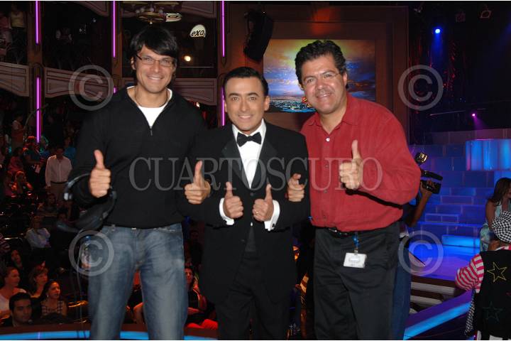 MÈXICO,D.F.22MAYO2006.- Culminò con èxito el reality show "Cantando por un Sueño". Los productores, Santiago y Rubèn Galindo posan junto con el conductor Adal Ramones durante la ùltima emisiòn del programa. FOTO: Televisa/CUARTOSCURO.COM