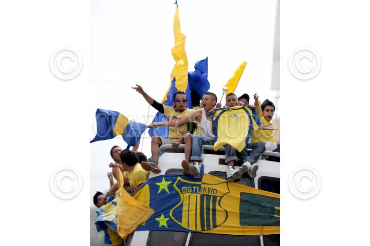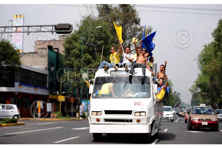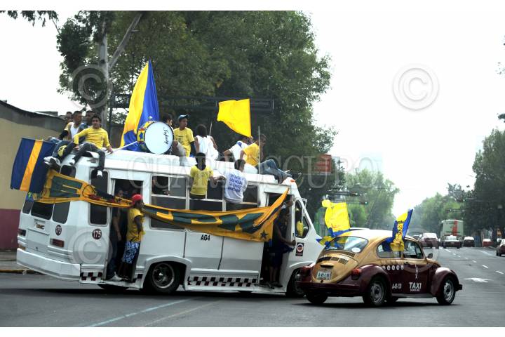 MÉXICO, D.F., 25OCTUBRE2009.- Jóvenes aficionados al equipo américa viajan en el toldo de un microbus por calles de la ciudad con dirección al Estadio Azteca cantando las porras de su equipo que jugara el clásico de clásicos contra las chivas del Guadalajara. FOTO: LUIS CARBAYO/CUARTOSCURO.COM