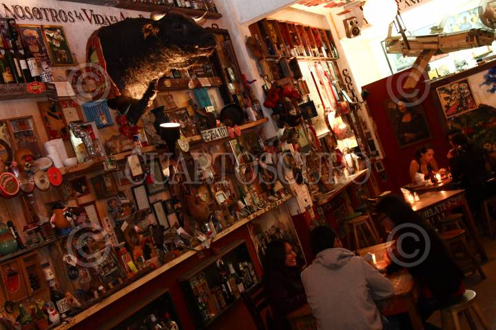 MEXICO, D.F., 07ENERO2011.- Jóvenes platican durante su estancia en la "Hostería Cultubar La Bota", cantina fundada en el año 2005. Ubicada en la calle de San Jerónimo casi esquina con Isabel la Católica en el Centro de la Ciudad de México estimula la proyección de artístas independientes (foro/literatura y publicaciones/arte en espacio público/talleres y visitas guiadas). Esta cantina forma parte del inicio de la nueva temporada del "Paseo de Cantinas en el Centro Histórico", recorrido nocturno realizado los días jueves en sitios emblemáticos a bordo de una réplica de un tranvía del siglo XIX que recorre algunos de los más importantes puntos del Centro Histórico de la Ciudad de México. Esto es organizado por la dirección de divulgación cultural de la Secretaría de Cultura del Distrito Federal. FOTO: MISAEL VALTIERRA/CUARTOSCURO.COM