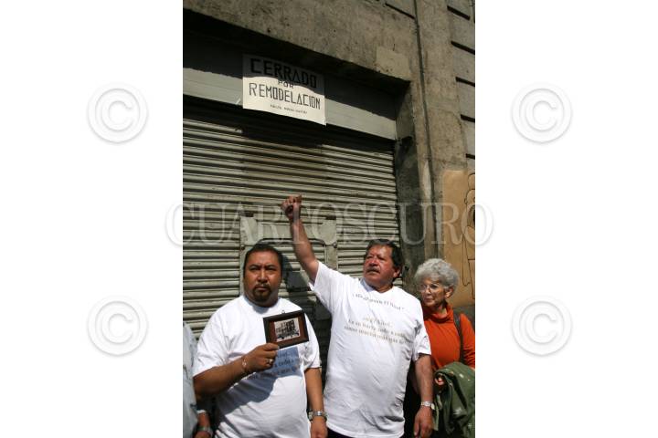 MÉXICO D.F. 29ENERO2008.-Retauranteros y parroquianos de la Cantina el Nivel, protestan a las afueras de esta, por su cierre indefinido y en espera de que se llegue a una negociación a con las autorides correspondientes para poder reabrir, después de la perdida del litigio en el que se encontraba antes de fallecer su anterior dueño.En la imagen Aurelio Sandoval y Rogelio Frausto Rodríguez, cantineros de este lugar. FOTO: GUILLERMO PEREA/CUARTOSCURO.COM