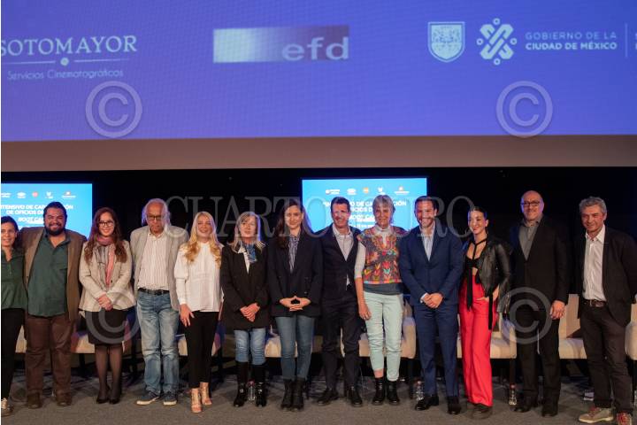 Carla Sánchez Armas, Mónica Lozano, Claudia Curiel de Icaza, Avelino Rodríguez, María Novaro, Guillermo Saldaña, y Eréndira Ibarra, durante la presentación del "Intensivo de Capacitación de Oficios de Cine Boot Camp", en el Faro Cosmos.