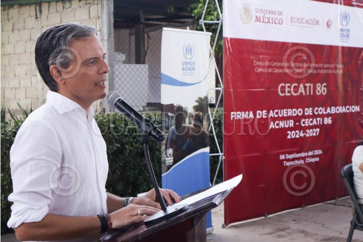TAPACHULA, CHIAPAS, 06SEPTIEMBRE2024.- Giovanni Lepri, representante de ACNUR en México, declaró durante la firma de convenio entre el Centro de Capacitación para el Trabajo Industrial (CECATI) 86 y la Agencia de la ONU para los Refugiados para que personas en calidad de refugiados puedan ser capacitadas en diferentes oficios. Estas personas dejaron sus casas y entorno en contra de su voluntad por lo que al llegar a un país como México el hecho de encontrar instituciones como CECATI que les permita capacitarse para formalizar sus conocimiento y recibir un certificado les abre la posibilidad de una nueva profesión. La mayoría que toma las capacitaciones son de población haitiana, guatemalteca, salvadoreña y hondureña y basta el día de hoy se han contabilizado con 74 personas refugiados en las diferentes áreas técnicas. FOTO: DAMIÁN SÁNCHEZ/CUARTOSCURO.COM