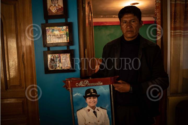 El padre Yamileth Nataly, la universitaria de 17 años que murió en los enfrentamientos del pasado nueve de enero, posa junto a un retrato de su hija.
