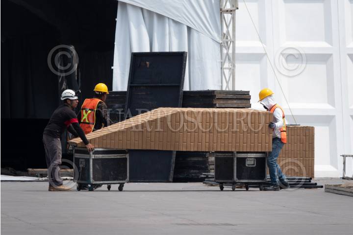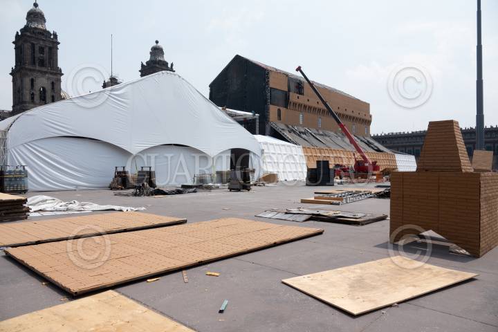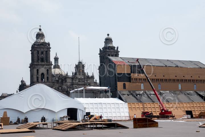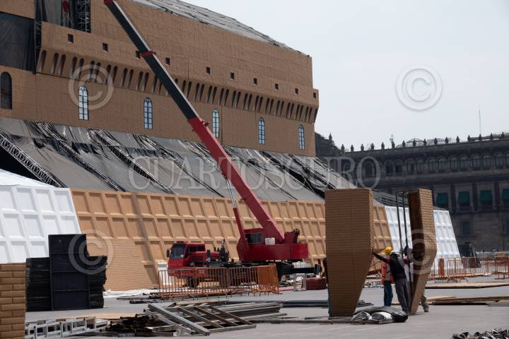 Trabajadores continúan con la construcción de la Réplica de la Capilla Sixtina que se instalará en el Zócalo capitalino del 19 de abril al 19 de mayo.