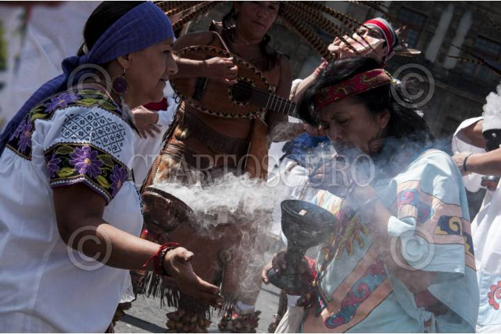 CIUDAD DE MÉXICO, 02OCTUBRE2016.- Danzantes prehispánicos, ataviados con penachos, realizarón una ceremonia al Sol, en la explanada de la plaza de la Constitución. FOTO: PAULINA NEGRETE /CUARTOSCURO.COM