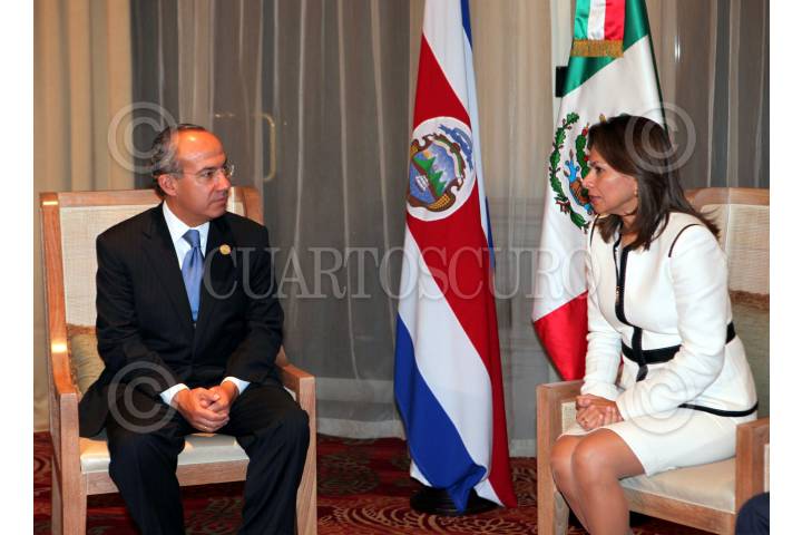 SAN JOSE, COSTA RICA, 07MAYO2010.- Felipe Calderón, Presidente de México, conversa con Laura Chinchilla Miranda, Presidenta electa de Costa Rica durante la reunión bilateral que realizaron en un hotel de la capital. FOTO: ARIEL GUTIERREZ/CUARTOSCURO.COM