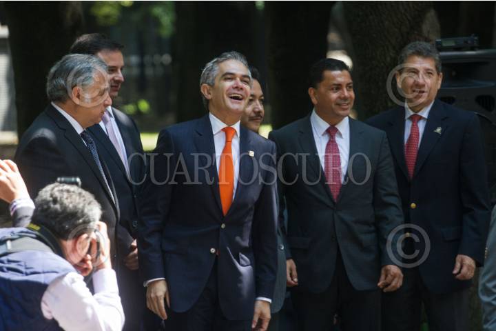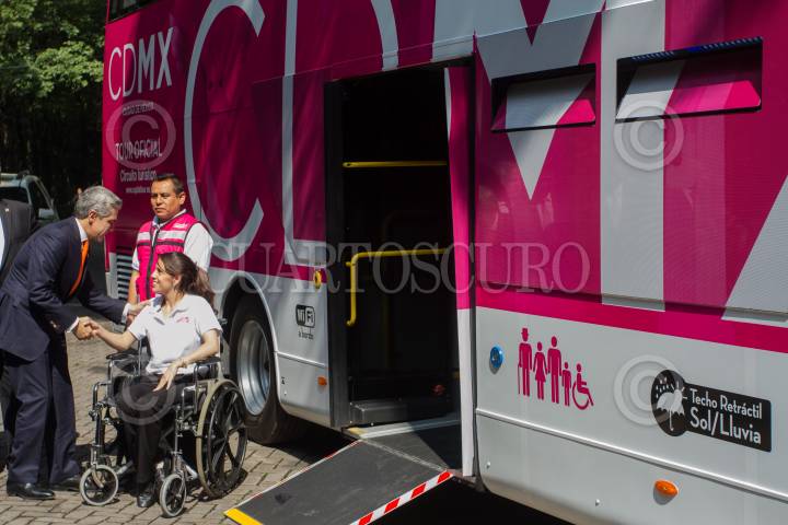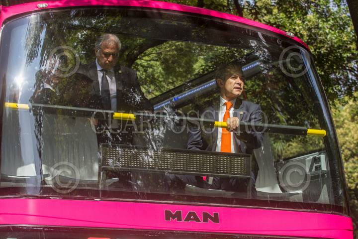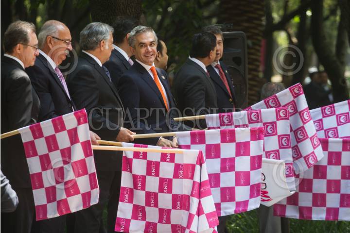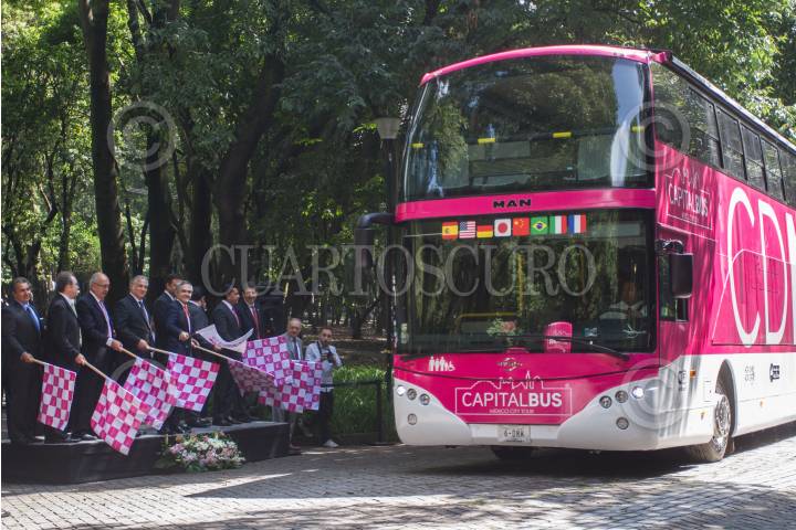 MÉXICO, D.F., 20JULIO2015.- Miguel Ángel Mancera, jefe de gobierno del D.F., dio el banderazo de salida al nuevo servicio de transporte turístico, Capital Bus, que recorra los principales atractivos de la ciudad en dos circuitos: Centro-Polanco, y Reforma-Santa Fe. FOTO: ISAAC ESQUIVEL /CUARTOSCURO.COM