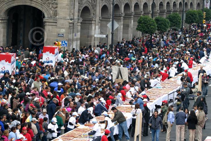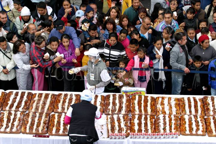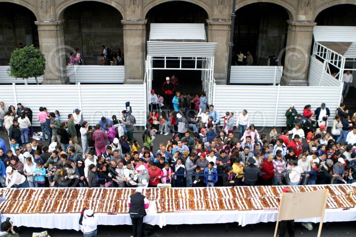 MÉXICO, D.F., 03ENERO2010.- Cientos de capitalinos acudieron a degustar la monumental Rosca de Reyes Bicentenario que rompió el record Guinness como la rosca de mayor peso y porciones que rodeo completamente el Zócalo capitalino. FOTO: RODOLFO ANGULO/CUARTOSCURO.COM