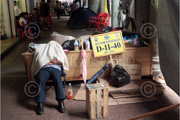 OAXACA, OAXACA 17JUNIO2010.- Tras 17 días de espera, maestros de la Sección 22 del Sindicato Nacional de Trabajadores de la Educación permanecen en plantón en el Zócalo Capitalino. Sentados o durmiendo sobre sillas, cartones o colchonetas, aguardan las respuestas del Gobierno Federal a su pliego petitorio. FOTO: MAX NÚÑEZ/CUARTOSCURO.COM