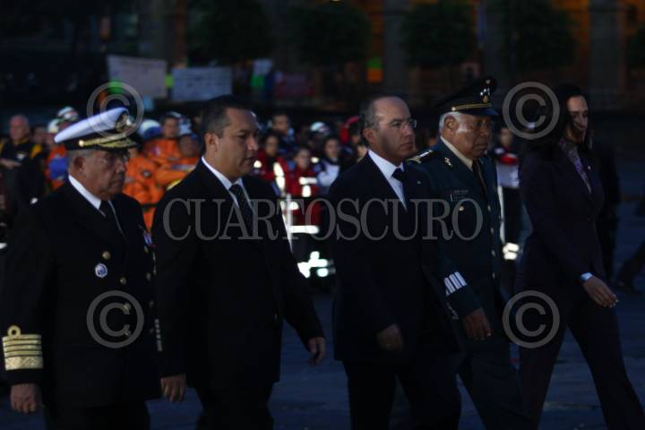 MÉXICO D.F., 19SEPTIEMBRE2010.- El presidente Felipe Calderón acompañado de Francisco Saynez, secretario de Marina; José Francisco Blake Mora, secretario de Gobernación; Guillermo Galvan, secretario de la Defensa Nacional y Laura Gurza Jaidar, coordinadora general de Protección Civil a su llegada al acto del izamiento de Bandera por motivo de los sismos de 1985 que se realizo en la explana del Zócalo capitalino. FOTO: RODOLFO ANGULO/CUARTOSCURO.COM
